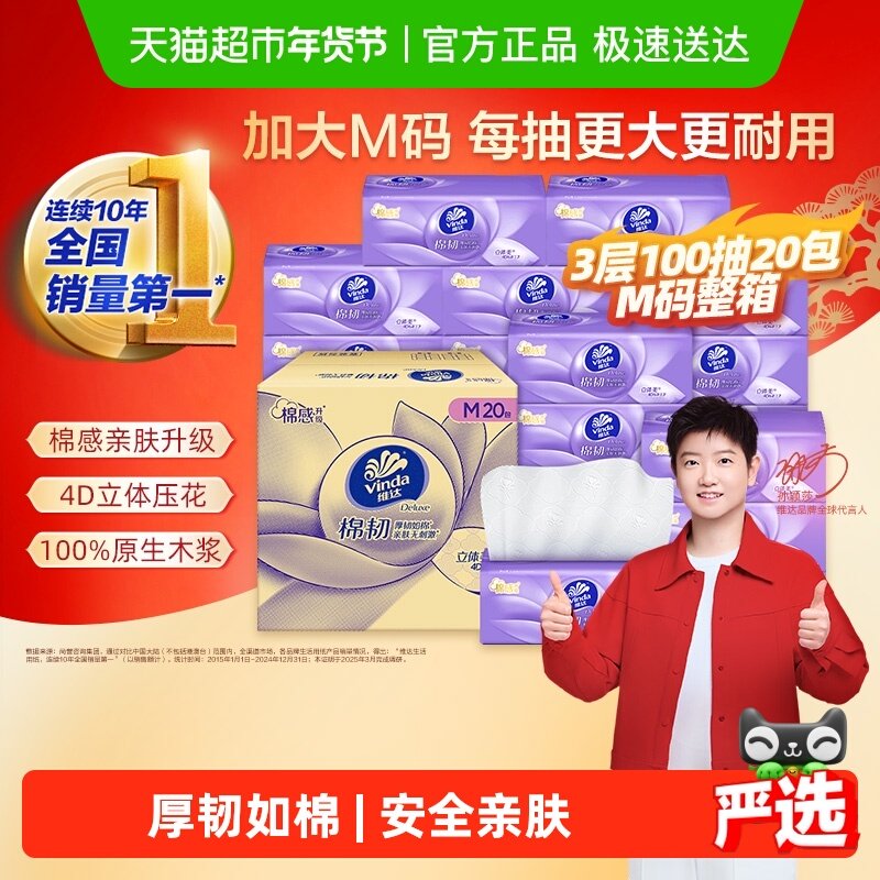 【孙颖莎推荐】维达棉韧压花抽纸3层M码纸巾家用纸巾卫生纸整箱装