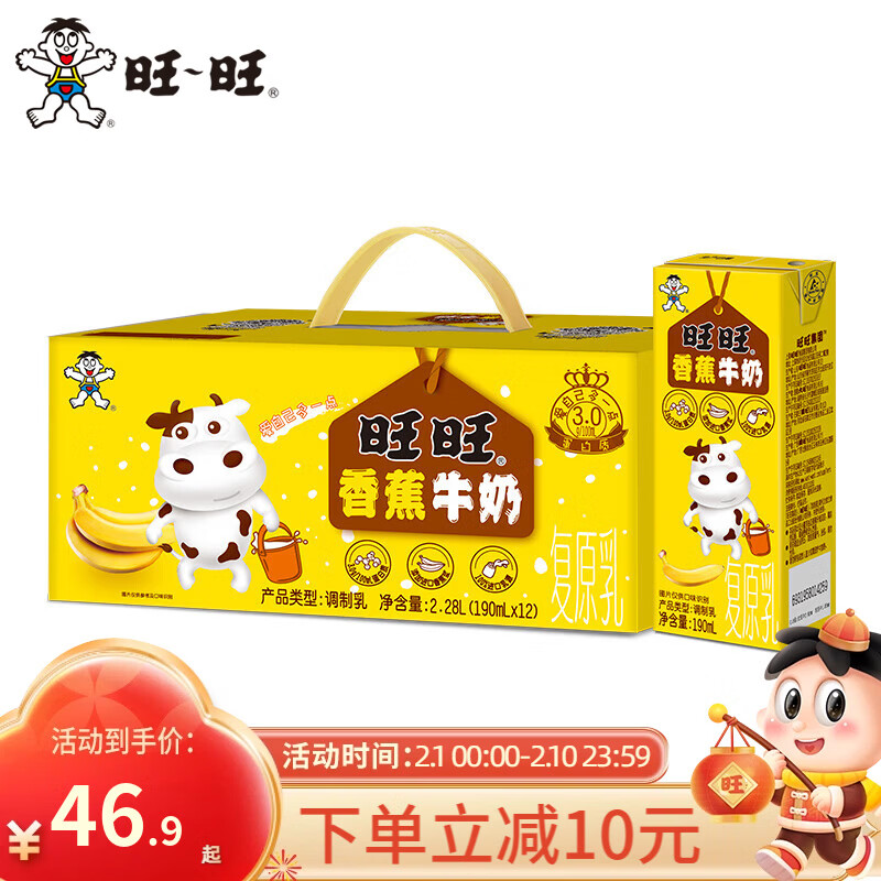 旺旺 香蕉牛奶草莓牛奶 年节礼物常温早餐牛奶饮品整箱盒装不同规格 香蕉牛奶190ml*12包