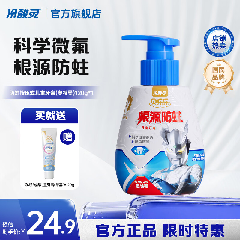 冷酸灵贝乐乐防蛀按压式儿童牙膏2-12岁小马宝莉奥特曼微氟配方根源防蛀 奥特曼(草莓奶昔风味) 120g*1瓶