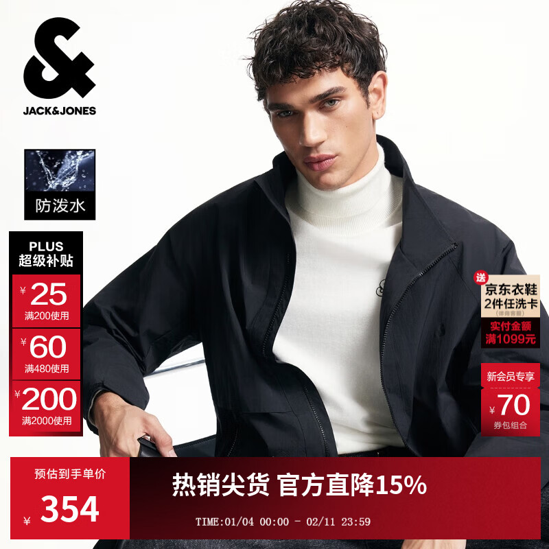 杰克·琼斯(JACK&JONES)25年男装秋季外套男休闲纯色宽松拉链口袋长袖简约立领外套上衣 E43纯黑色 M (175)