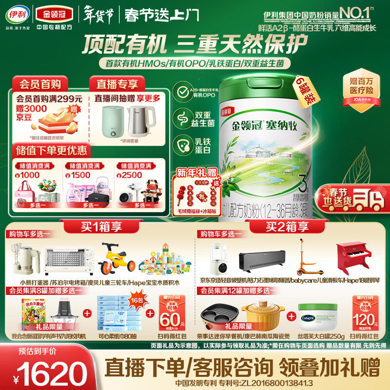 伊利金领冠塞纳牧首款HMO有机A2β-酪蛋白奶粉3段1-3岁800g*6罐
