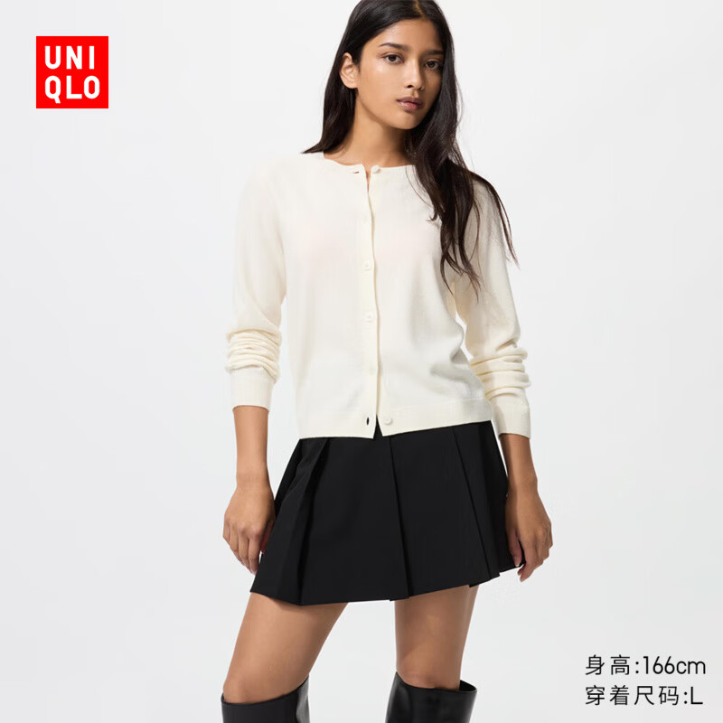 优衣库女装羊绒圆领针织短开衫/25秋冬新款479672 01 乳白色 L