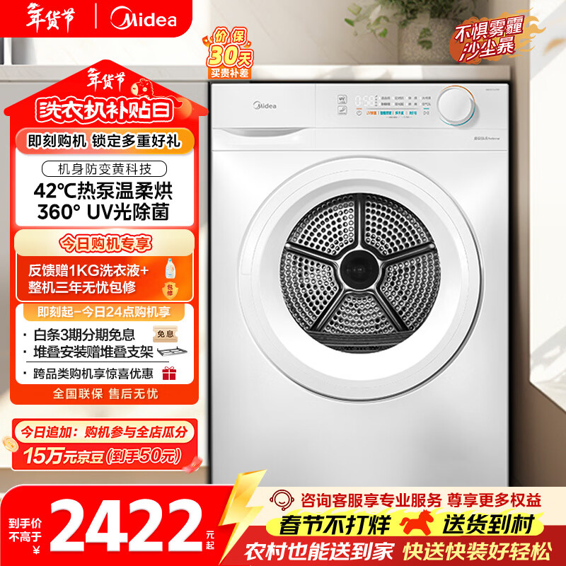 美的(Midea)热泵烘干机10KG 紫外线除菌除螨 五层毛屑过滤 超薄大筒径 MH100V11F 以旧换新 京东自营