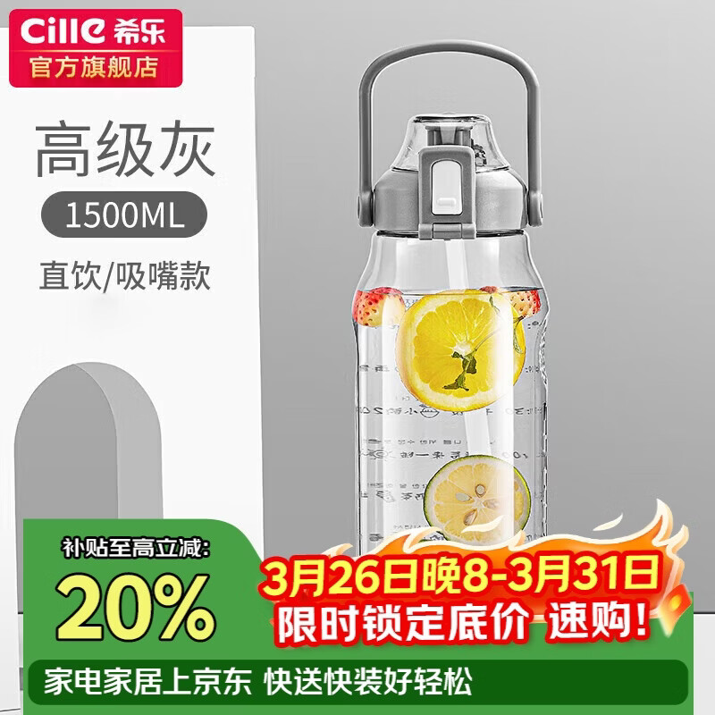 希乐大容量水杯子男女户外健身吸管杯tritan材质塑料杯1.5L灰-2219