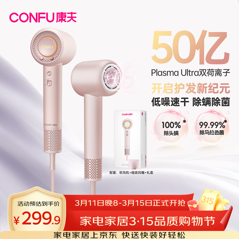 康夫(CONFU)高速护发吹风机50亿等离子家用大功率大风力速干 生日礼物送女友 电吹风筒F9Pro初樱粉