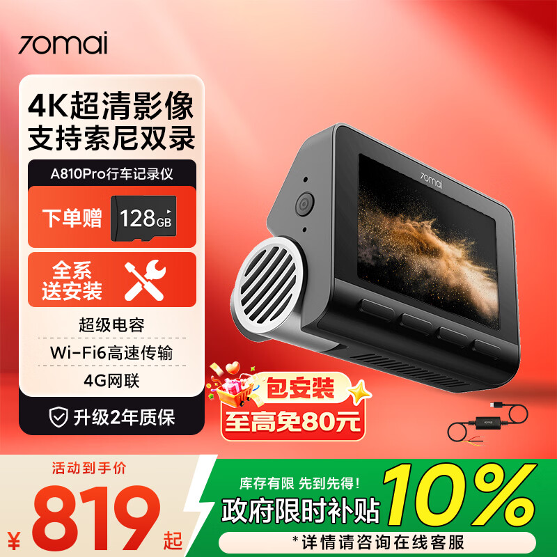 70迈A810Pro行车记录仪 4K超清夜视 黑光全彩+监控线