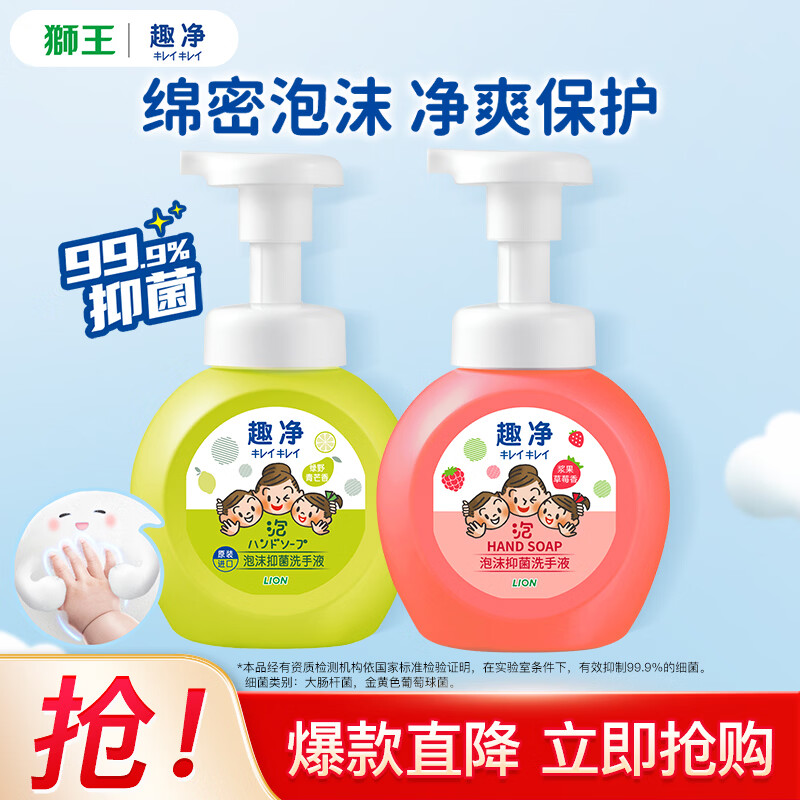 狮王(Lion)趣净泡沫洗手液99.9%抑菌保湿儿童成人通用 原装进口 洗手液青芒香+草莓香共2瓶