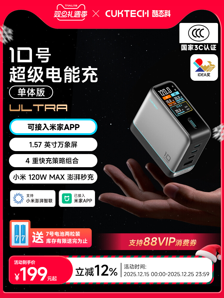 【iPhone17新机首选】CUKTECH酷态科10号超级电能充ultra氮化镓充电器17ProMax多口120W大功率16适于苹果小米