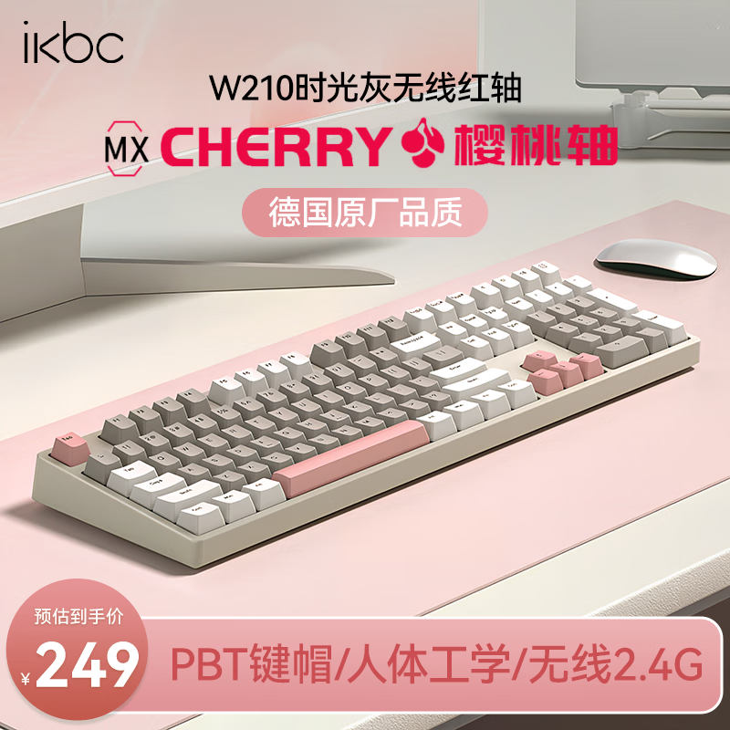 ikbcW210无线键盘机械键盘108键电竞游戏键盘办公打字手感好电脑键盘樱桃键盘新年礼物 时光灰红轴无线