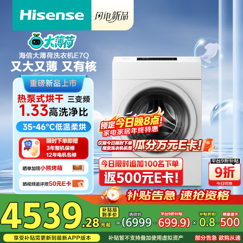海信(Hisense)大薄荷热泵洗烘一体E7Q洗衣机 全自动滚筒洗衣机13公斤大容量 活水洗 WH130E7Q 国家补贴