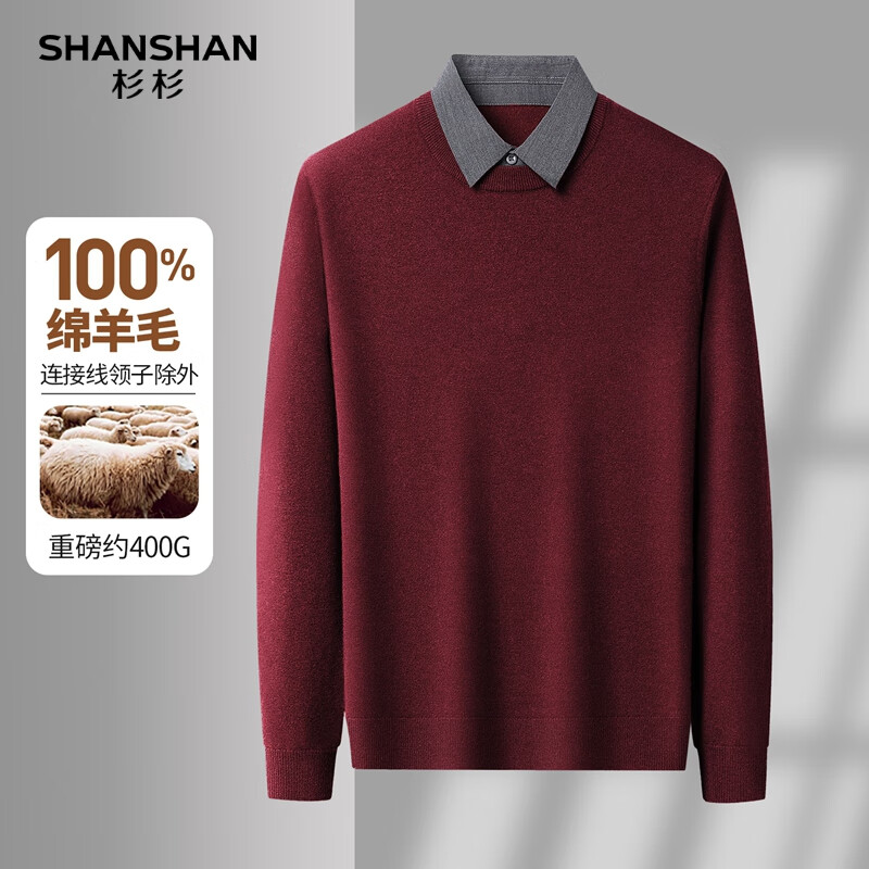 SHANSHAN杉杉纯羊毛衫男秋冬绵羊毛加厚保暖翻领毛衣针织内搭上衣假两件男 酒红色 L /175