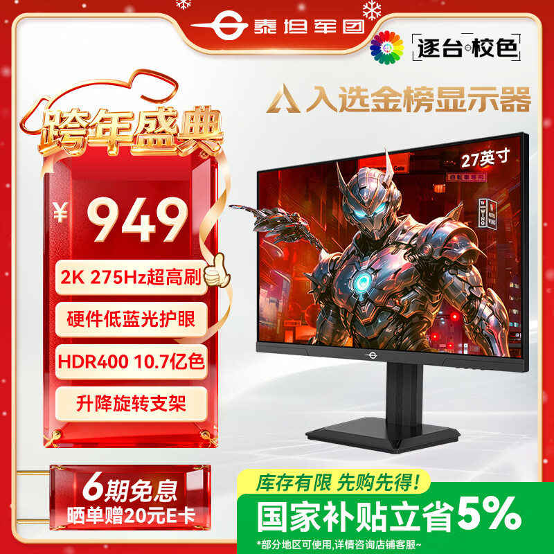 泰坦军团27英寸 2K 275Hz超高刷新率HDR400 FastIPS 10.7亿色 硬件低蓝光 旋转升降电竞显示器240Hz P2710S