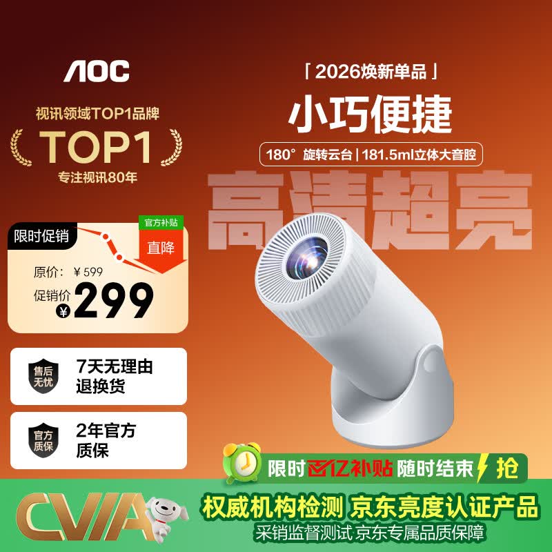 AOCFree 3 一体式云台投影仪 家用高清家庭影院 学生宿舍卧室手机无线投屏小巧便携智能小型投影机