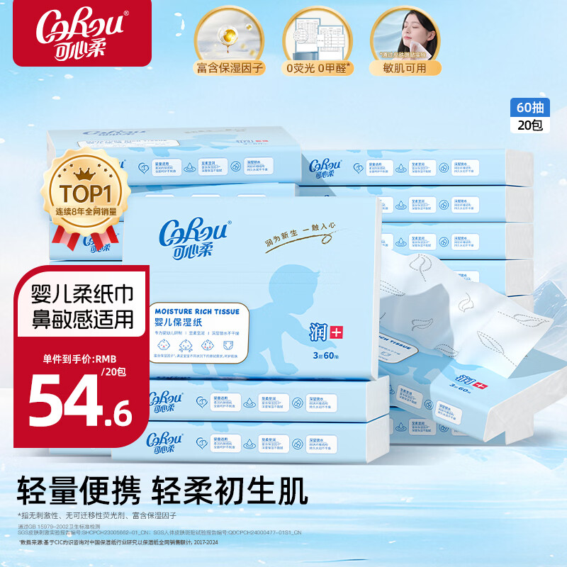 婴儿纸巾云柔巾60抽20包新生儿柔纸巾专用宝宝保湿乳霜纸儿童抽纸