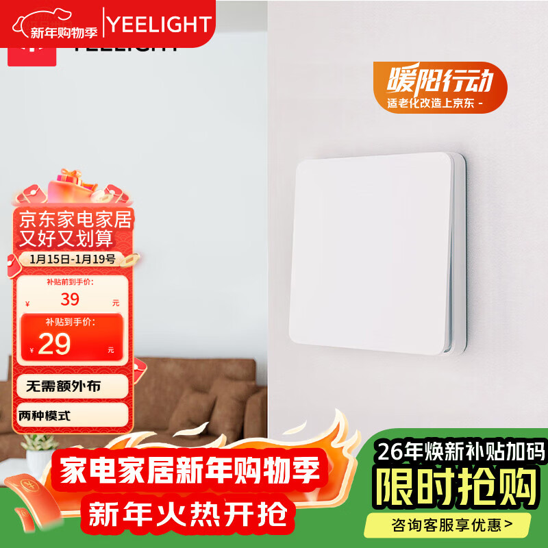 Yeelight易来凌动开关插座单开适用客厅卧室吸顶灯墙壁开关自回弹不离线