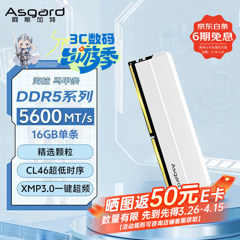 阿斯加特(Asgard)16GB DDR5 5600 台式机内存条 海拉 马甲条 精选颗粒 CL46 极地白