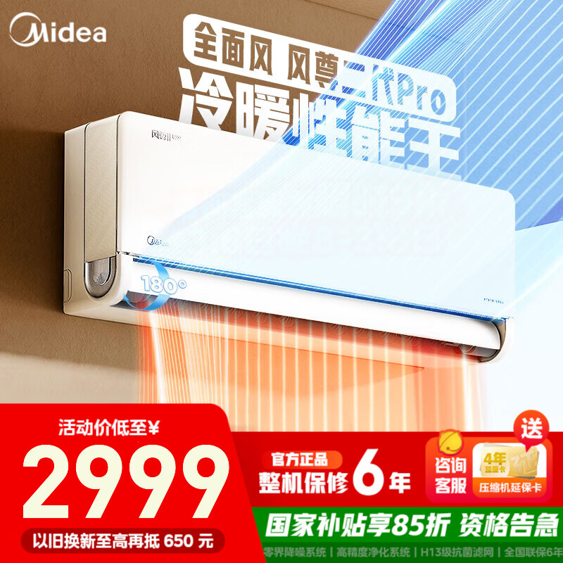 美的(Midea)空调挂机 风尊三代/二代 全面风 四季空调 新一级能效变频冷暖 舒适省电 智能除菌家用 家电补贴 风尊二代Pro 大1.5匹 双排冷凝