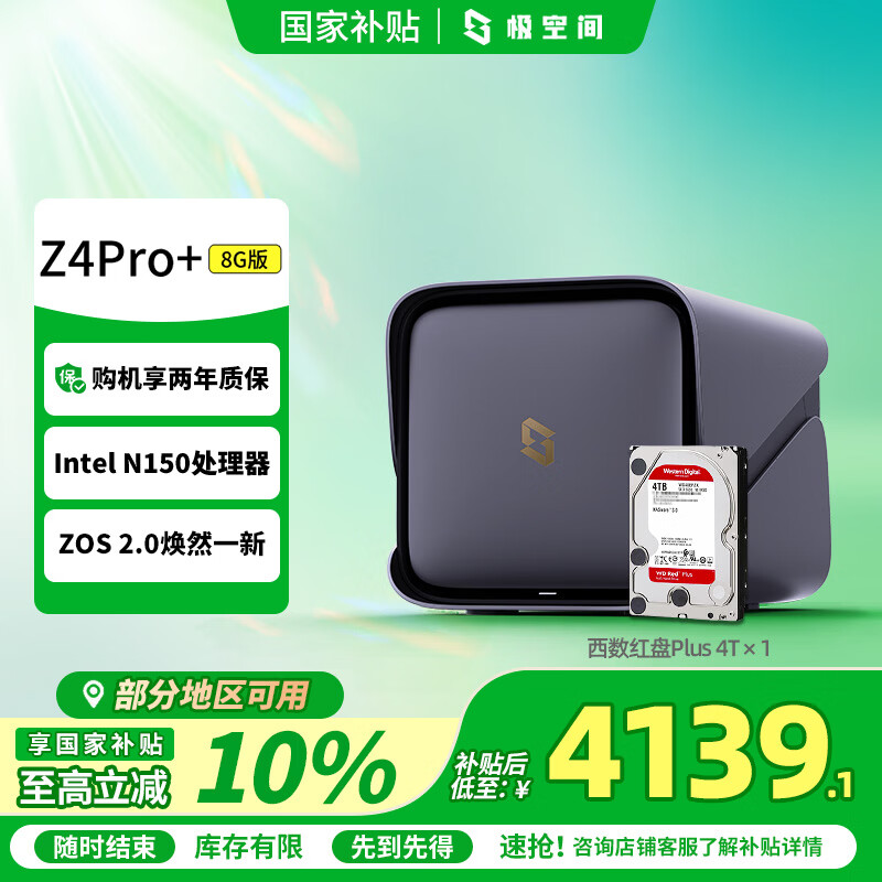 极空间私有云Z4Pro+ 8G版 4T四盘位Nas智能家庭娱乐企业办公网络存储服务器(搭配1块西数红盘 4TB硬盘)