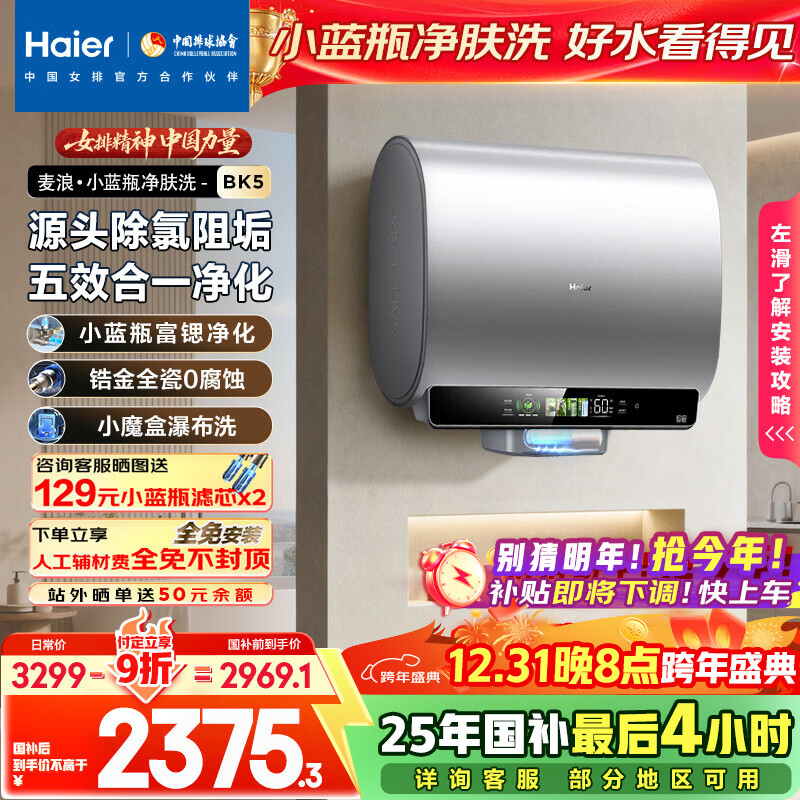 海尔(Haier)麦浪套系电热水器 国家补贴20%双胆扁桶60升BK5 富锶小蓝瓶净肤洗 锆金全瓷3300W速热家用一级能效
