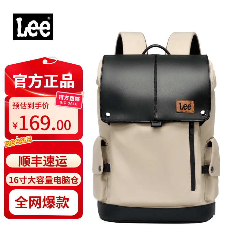 Lee双肩包男大容量商务休闲背包女旅行包通勤电脑包大学生登山包书包 杏棕色【防泼水/耐磨/耐脏/可挂行李箱】