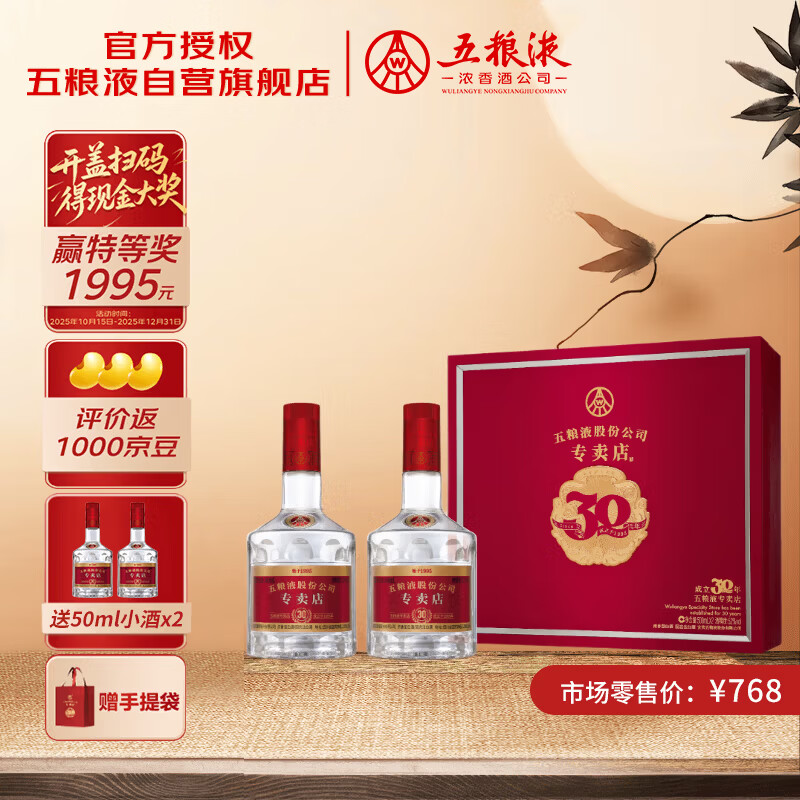 五粮液专卖店1995 浓香型白酒 52度 500mL*2瓶 礼盒装 送礼宴饮