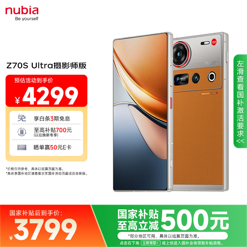 努比亚(nubia)Z70S Ultra摄影师版 国家补贴 真全面屏 16+512GB 熔金 骁龙8至尊版 6600mAh 游戏AI手机【苏超】