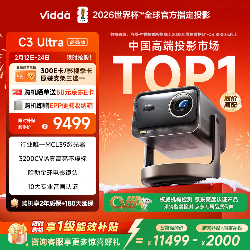 Vidda C3 Ultra高亮版 海信4K超高清三色激光投影仪家用投影机 3200CVIA+MCL39激光器 家庭影院国家补贴