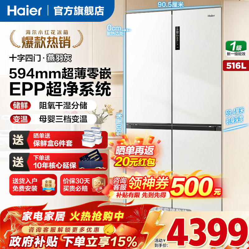 º£¶û£¨Haier£©¡¾ÐÂÆ·Ð¡ºì»¨2.0¡¿516Éýµç±ùÏä594mm³¬±¡ÁãǶÈëʽ60cmÒÔÄÚÊ®×Ö¶Ô¿ªTÐÍËÄ¿ªÃÅ¿¹¾ú¾»Î¶¹ú¼Ò²¹Ìù20% 516Éý+ÑàÓð»Ò+³¬±¡ÁãǶ+EPP³¬¾»+¸Éʪ·Ö´¢