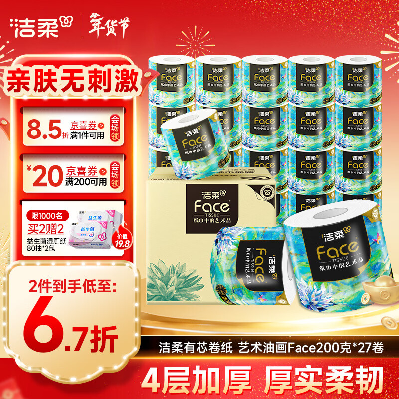 洁柔有芯卷纸 艺术油画Face4层200克*27卷 实惠 卫生纸卷筒纸纸巾整箱