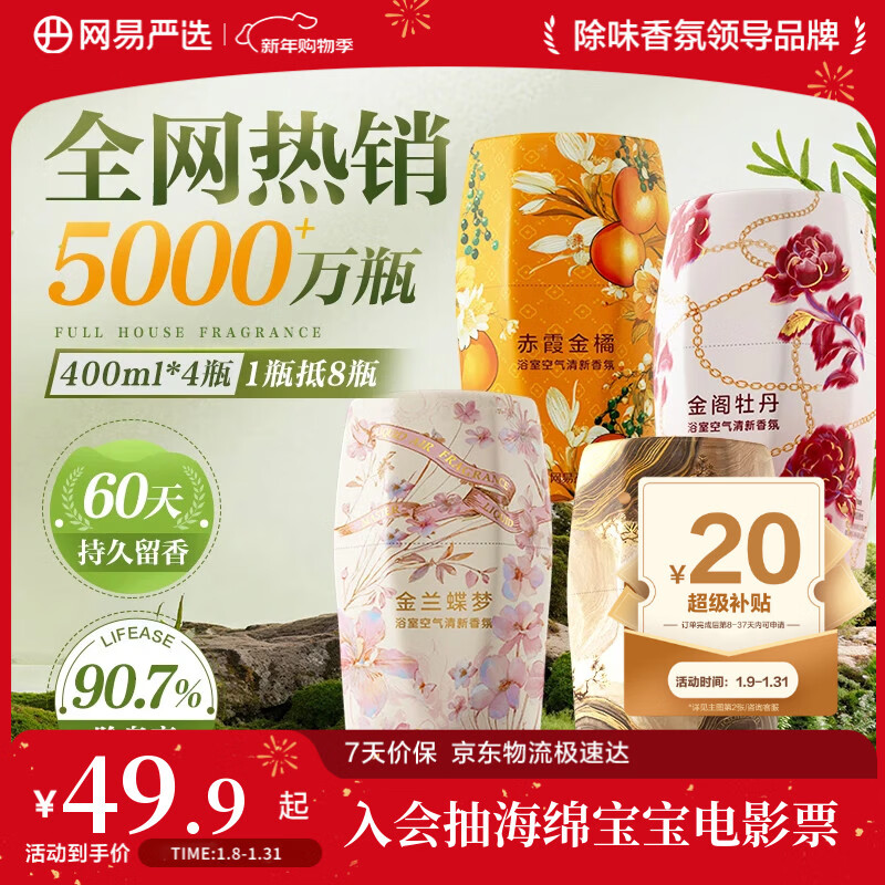 网易严选鎏金系列浴室香薰空气香氛 家用卫生间空气清新剂400ml*4瓶