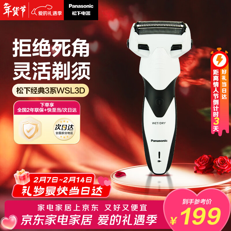 松下(Panasonic)情人节礼物经典3系电动剃须刀往复式男士电动刮胡刀进口三刀头全身水洗超长续航生日礼物男生WSL3D
