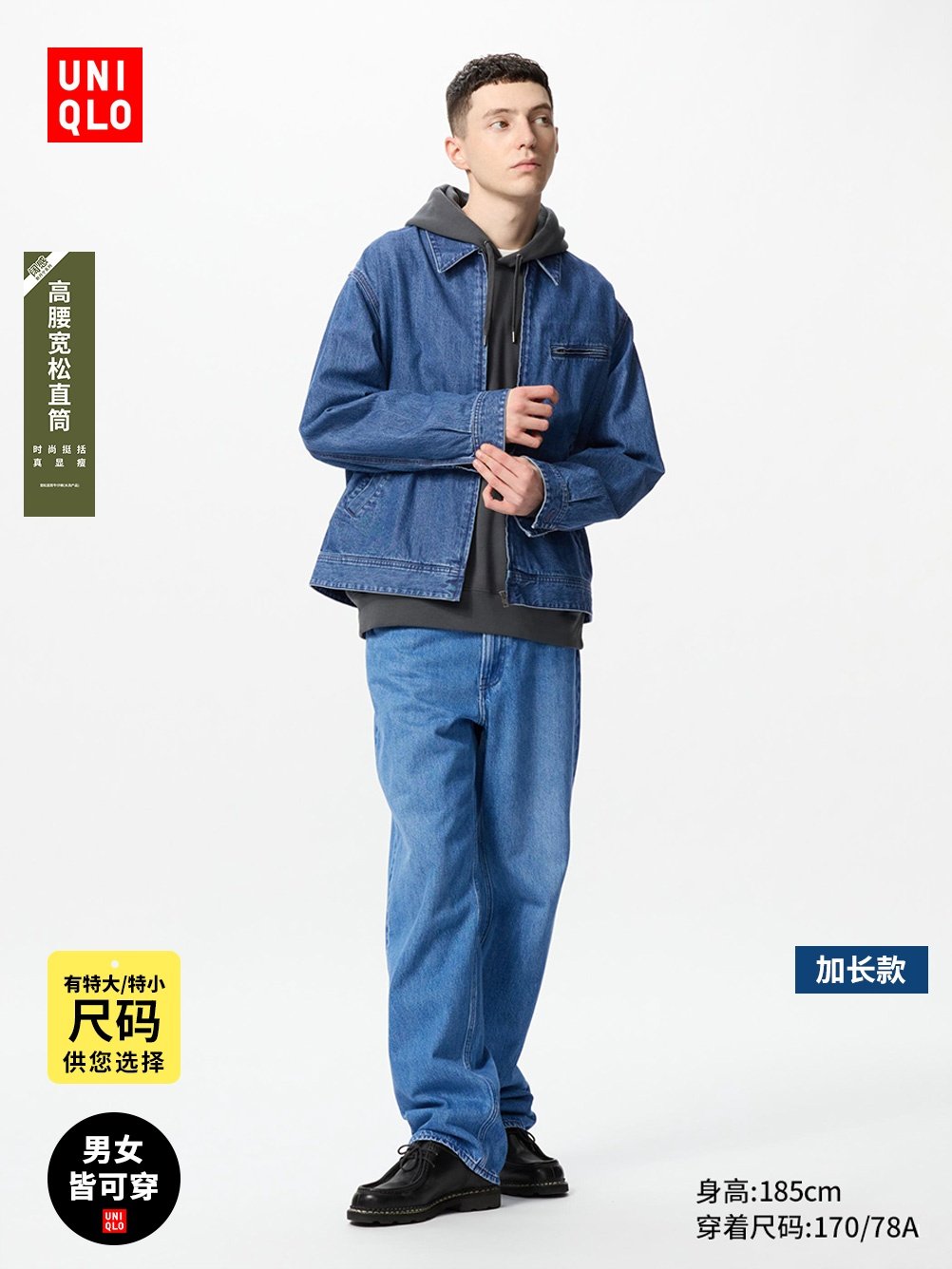 优衣库男装女装宽松直筒牛仔裤水洗裤子休闲长裤加长款84cm475552