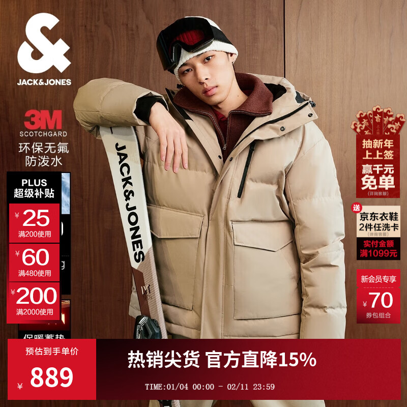 杰克·琼斯(JACK&JONES)男装25年冬季连帽严寒羽绒服男短款加厚防水蓄热鸭绒外套RDS认证 E11卡其色 M (175)