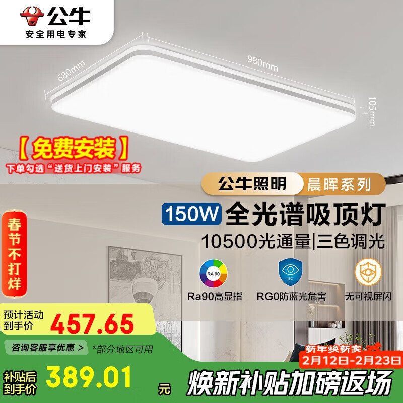 公牛(BULL)吸顶灯 X11系列MX-J150Z-BS全光谱三段调光客厅灯卧室灯150W
