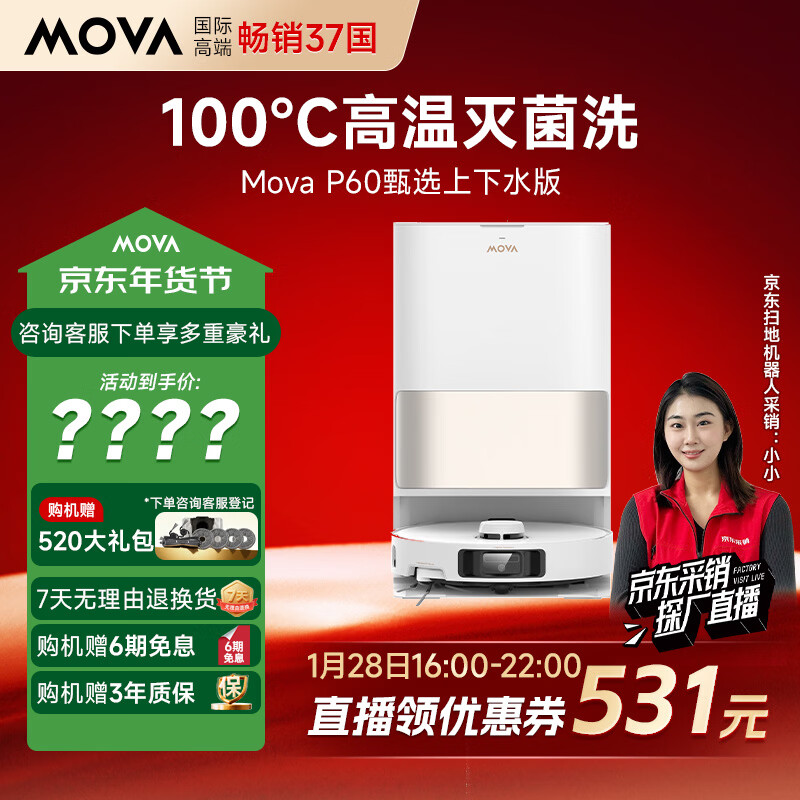 Mova【重磅新品】P60甄选扫地机器人扫拖一体自动清洗 热活水洗拖布吸扫一体机上下水版(需确认尺寸)