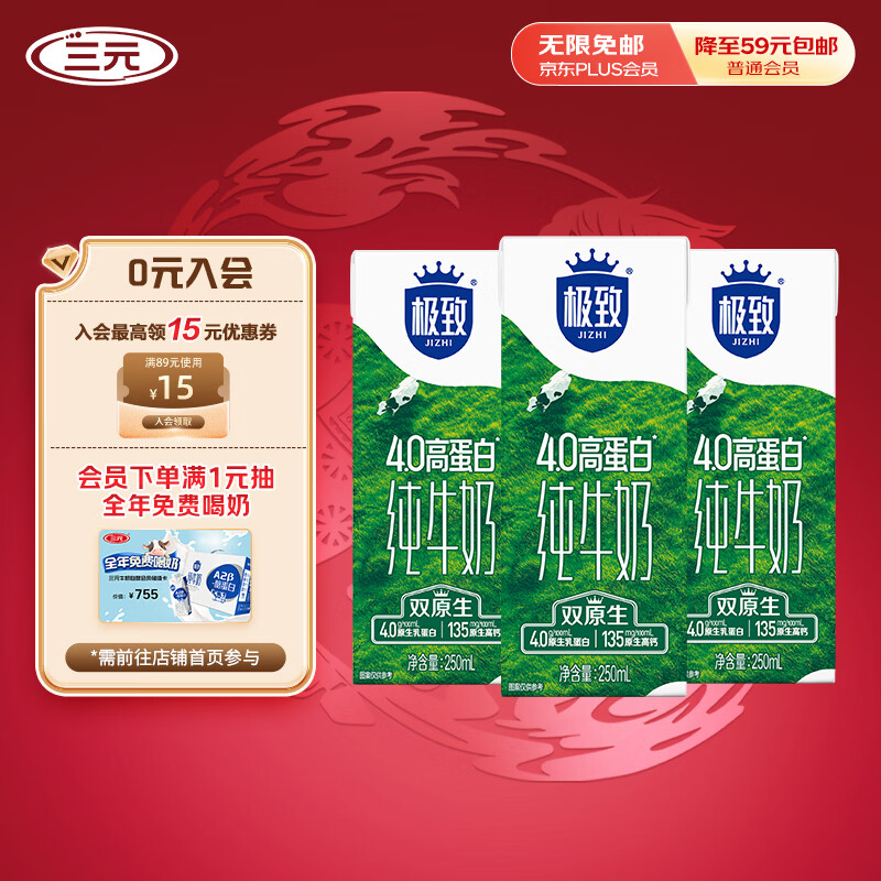三元极致4.0g原生高蛋白纯牛奶整箱250ml*3盒 135mg原生高钙