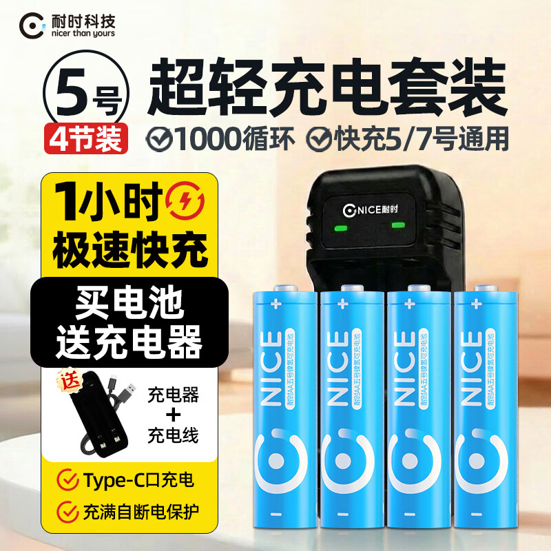 耐时(NICE)镍氢5号电池恒压快充充电池大功率用玩具游戏手柄门锁相机闪光灯麦克风门锁电池环保无汞 |5号600毫安4节|快充套装|限时买赠