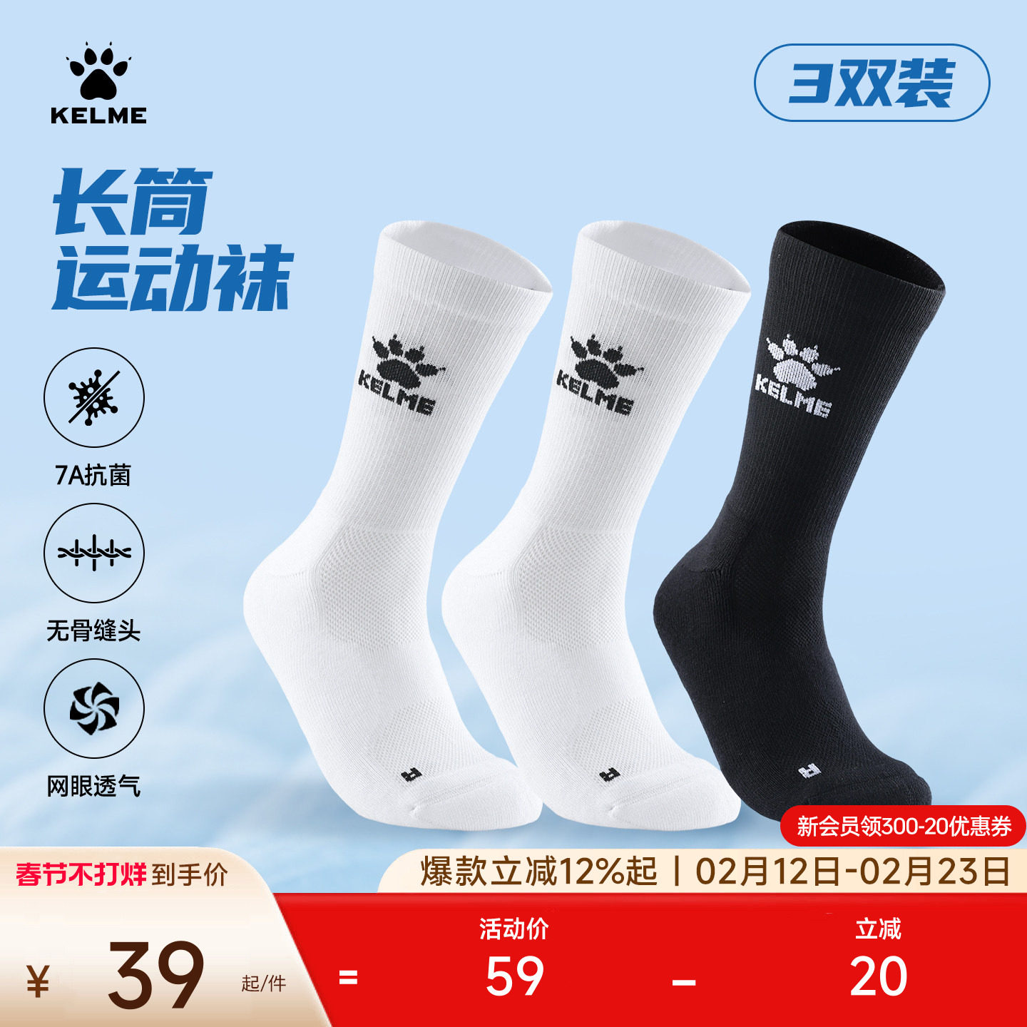 KELME卡尔美运动袜3双装毛巾底长筒运动袜男跑步篮球高筒抗菌袜子