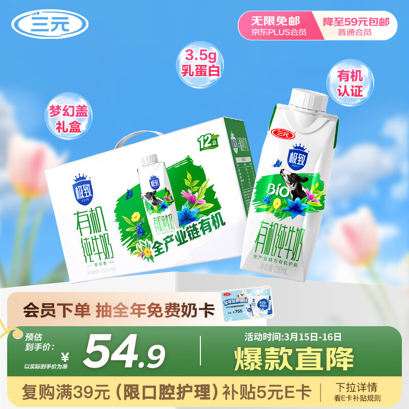 三元极致有机纯牛奶整箱250ml*12盒 梦幻盖 年货礼盒