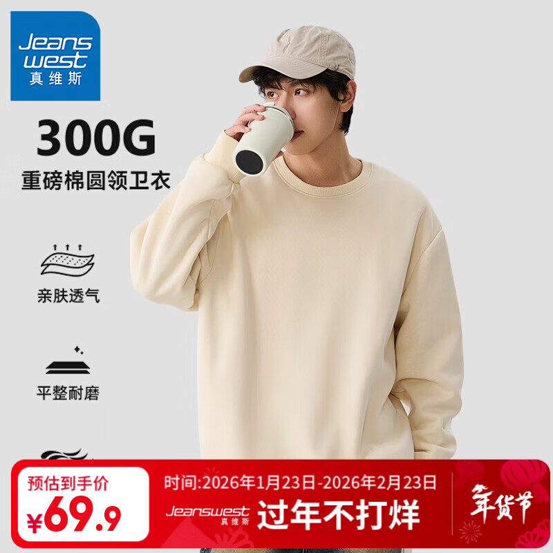 真维斯(Jeanswest)男士卫衣2025秋季新款青少年休闲时尚重磅款圆领无帽纯色薄外套 浅米#ZS纯色 XL