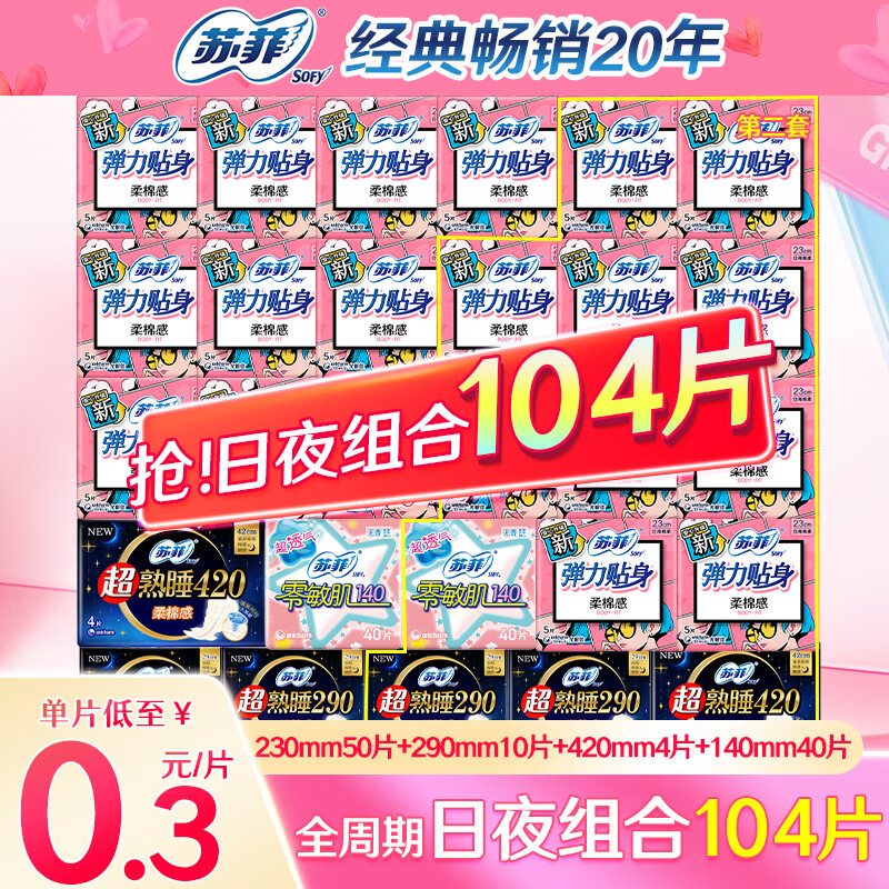 苏菲卫生巾230日用弹力贴身柔棉日夜290组合装姨妈巾 日夜组合104片【特慧装】