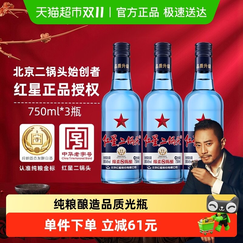 红星二锅头蓝瓶绵柔8纯粮43度750ml*3瓶清香型白酒纯粮口粮酒