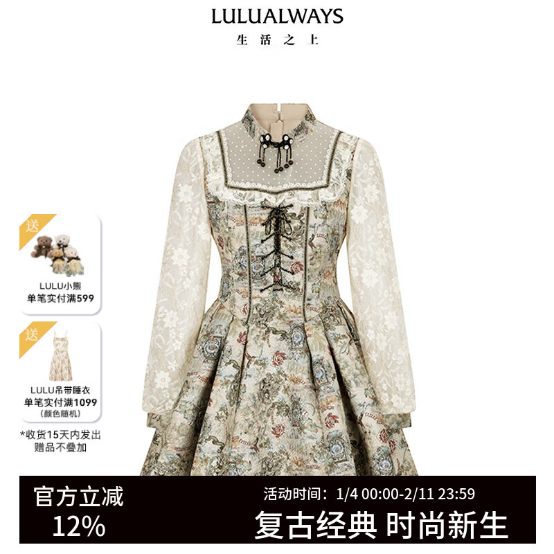 LULUALWAYS【商场同款】24秋季新款复古公主风高腰显瘦印花连衣裙 米白色 S