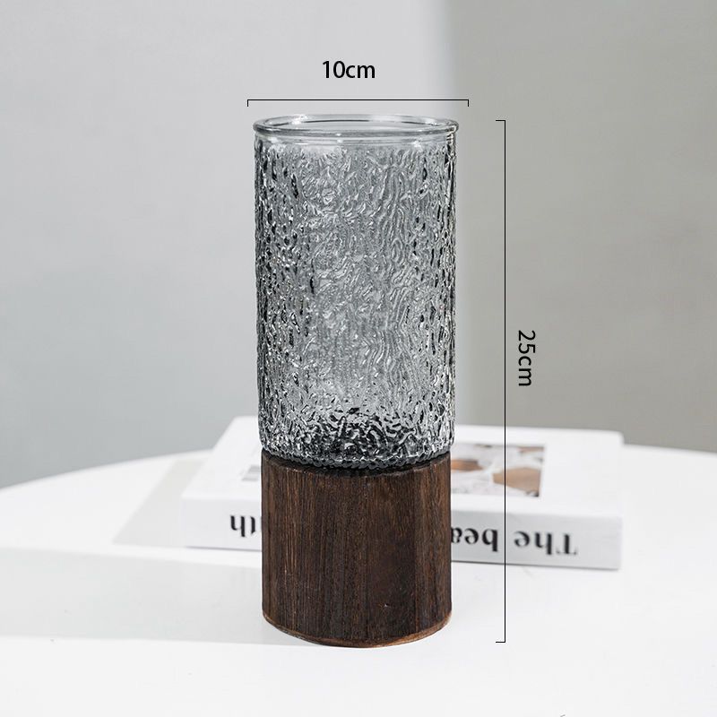 溥畔北欧玻璃花瓶中式木托直筒客厅插花装饰轻奢高级感玻璃水培摆件 冷纹/烟灰/带木托
