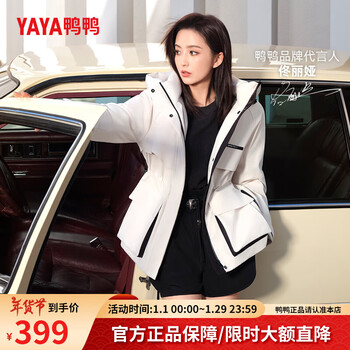 鸭鸭(YAYA)佟丽娅同款城市轻户外冲锋羽绒服女短款冬新款收腰撞色派克服外套 米色 165/88A(L)