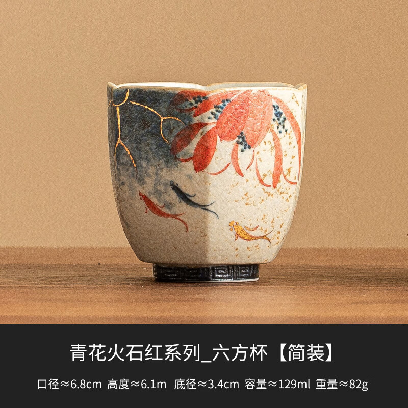 景盏青花火石红主人杯描金手绘荷韵锦鲤六方杯陶瓷茶杯品茗杯 青花火石红描金纯手绘荷韵_六方杯【简装】 129mL