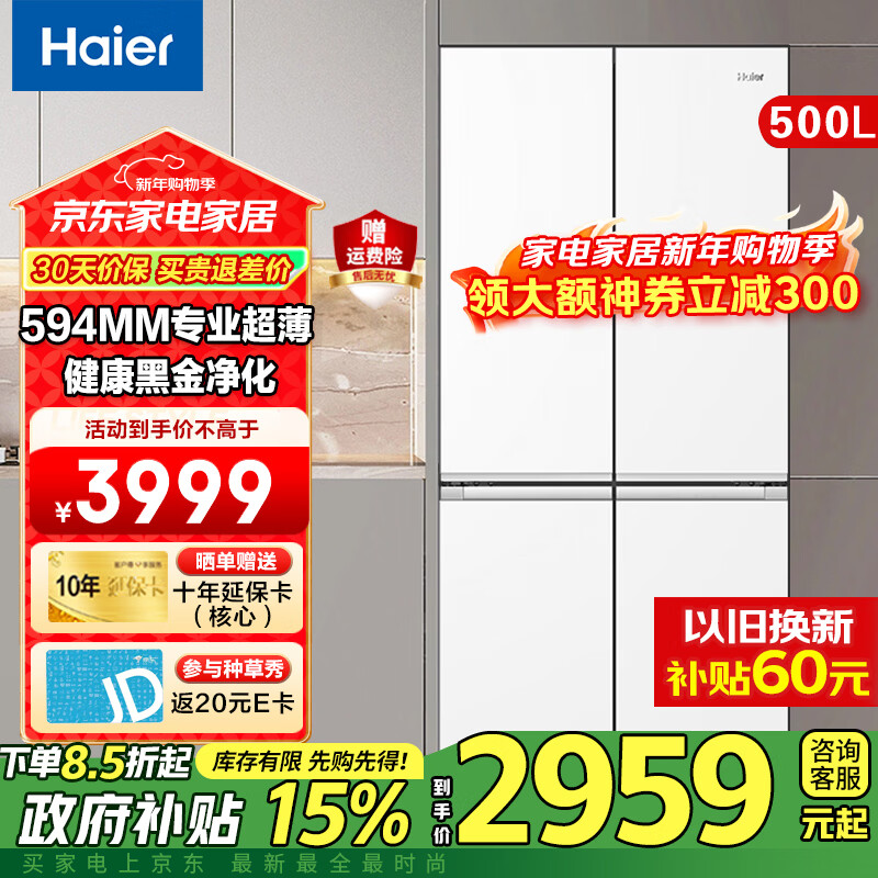 海尔(Haier)【小红花-绽放版】海尔冰箱500升四开门十字对开门594mm专业超薄一级能效节能家用电冰箱 594MM超薄+AI变频科技+健康黑金净化