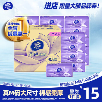 维达(Vinda)抽纸 棉韧3层100抽*20包M码 卫生纸纸抽 纸巾 整箱