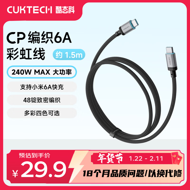 CUKTECH酷态科充电线Type-C数据线240W大功率6A电流ctoc编织快充适用苹果17/ipad/小米华为手机笔记本1.5m