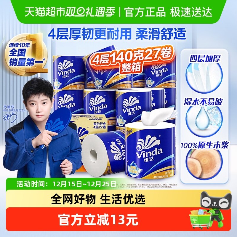 【孙颖莎推荐】维达蓝色经典有芯卷纸层卫生纸家用实惠箱装
